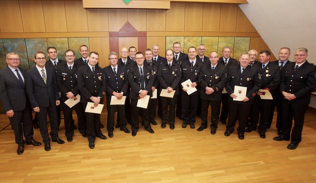 Alzey Kreis / VG Alzey Land, Verleihung Feuerwehr Ehrenzeichen, vl: Ernst Walter Görisch, Steffen Unger, re KFI Michael Matthes, 4.v.re. Beig. Hans Jürgen Fischer, Rest Geehrte